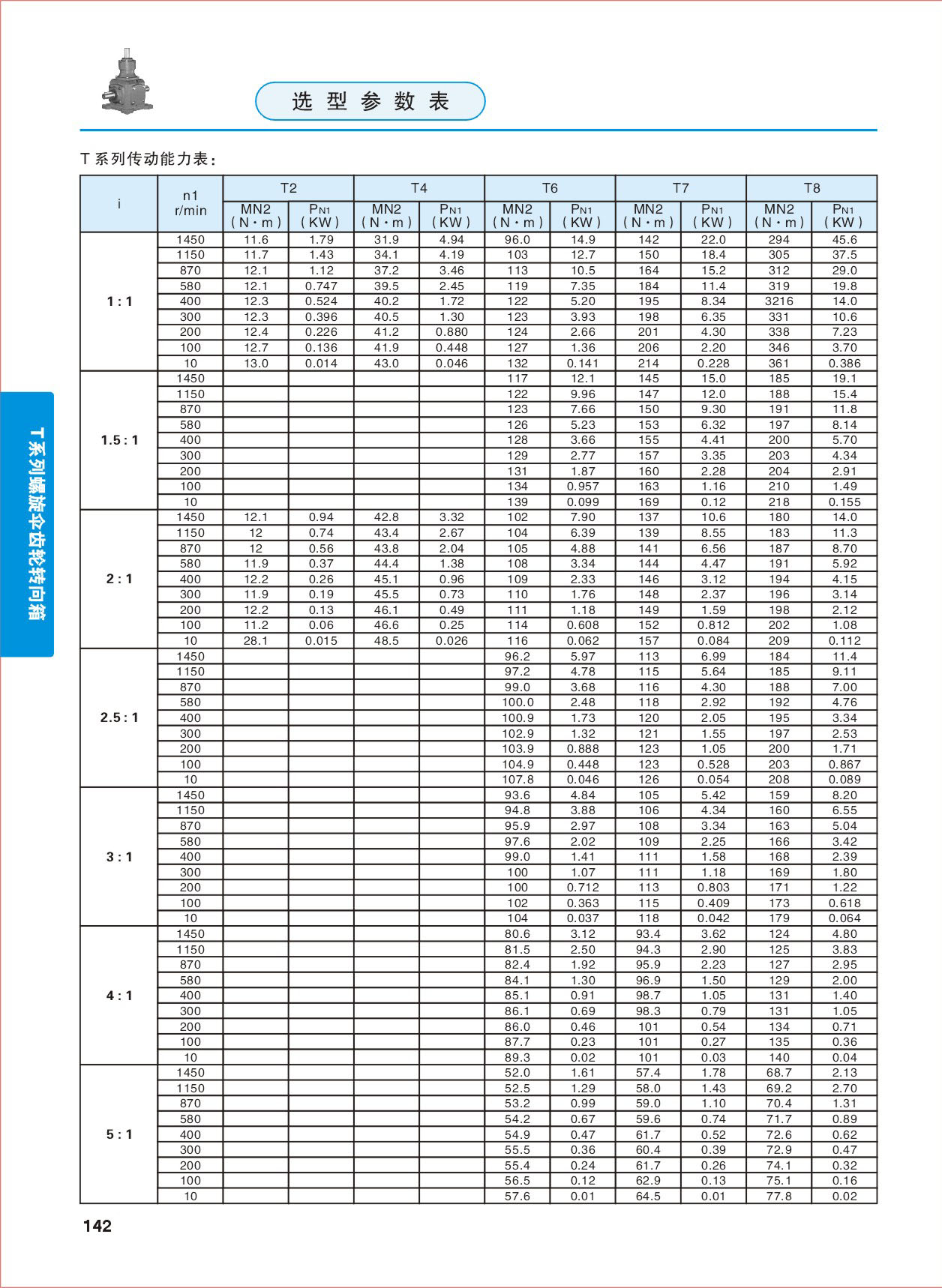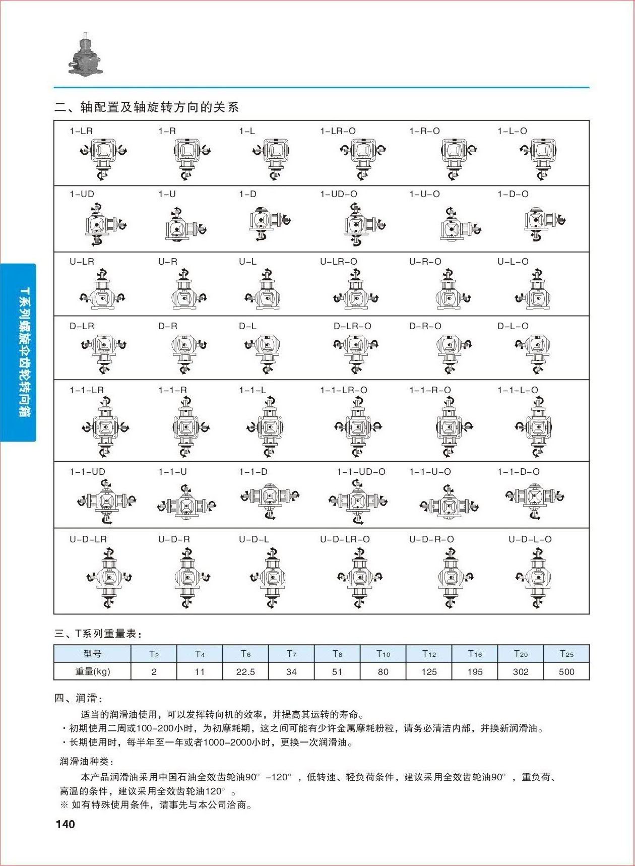 T螺旋錐齒輪換向器產(chǎn)品特點(diǎn): 1、機(jī)殼:采用高鋼性FC-25鑄鐵鑄造; 2、齒輪:采用優(yōu)質(zhì)高純凈度合金鋼50CrMnT調(diào)質(zhì)加工,經(jīng)滲碳淬火處理及研磨而成; 3、主軸:采用優(yōu)質(zhì)高純凈合金鋼40Cr調(diào)質(zhì)加工,具備高懸重負(fù)荷能力。 4、軸承:配備具重負(fù)荷能力的滾錐軸承; 5、油封:采用進(jìn)口雙唇油封,具有極高的防塵防漏油能力。 產(chǎn)品潤(rùn)滑: T系列螺旋錐齒輪換向器適當(dāng)?shù)臐?rùn)滑油使用,可以發(fā)揮轉(zhuǎn)向機(jī)的效率,并提高其運(yùn)轉(zhuǎn)的壽命。 1、減速機(jī)初期使用二周或100-200小時(shí),為初磨耗期,這之間可能有少許金屬磨耗粉粒,請(qǐng)務(wù)必清潔內(nèi)部,并換新潤(rùn)滑油; 2、長(zhǎng)期使用時(shí),每半年-一年或1000-2000小時(shí)更換一次潤(rùn)滑油。 技術(shù)參數(shù): 可配單橫軸、雙橫軸、單縱軸、雙縱軸 速 比:1:1 、1.5:1、2:1、2.5:1、3:1、4:1、5:1 產(chǎn)品型號(hào): T2、T4、T6、T7、T8、T10、T12、T16、T20、T25